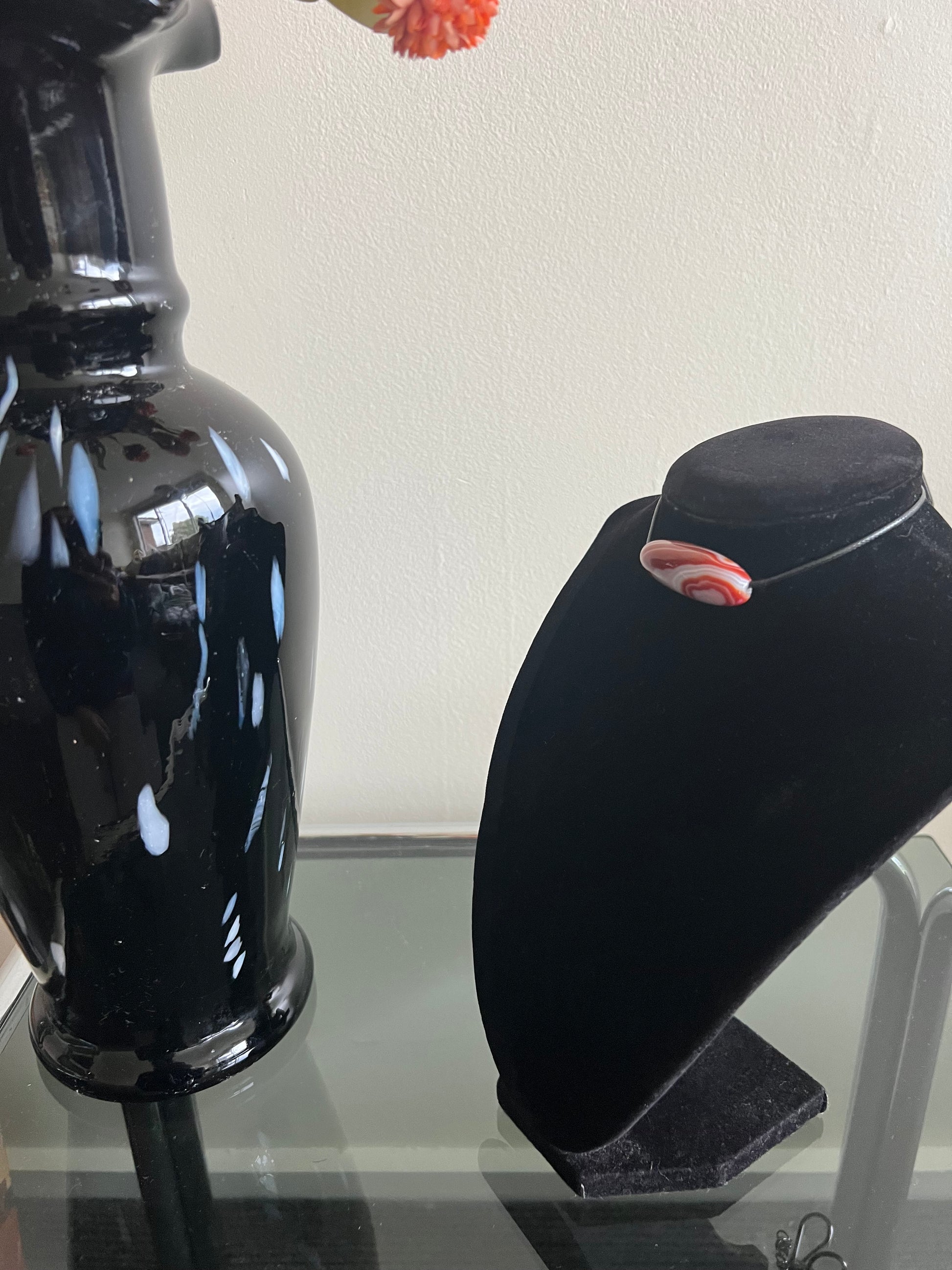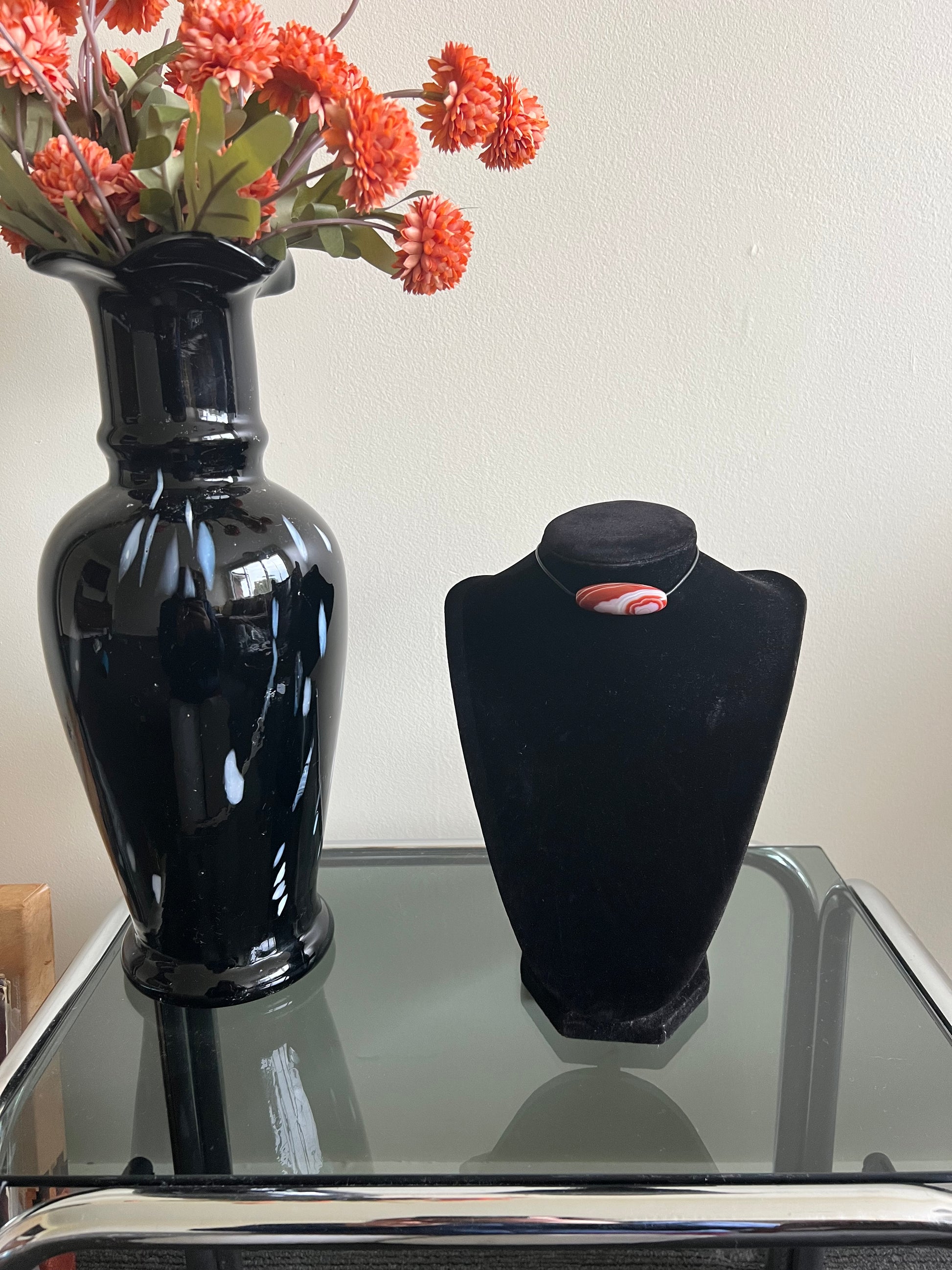 MATERIALS: black cord and a red / orange patterned glass bead with stainless steel findings