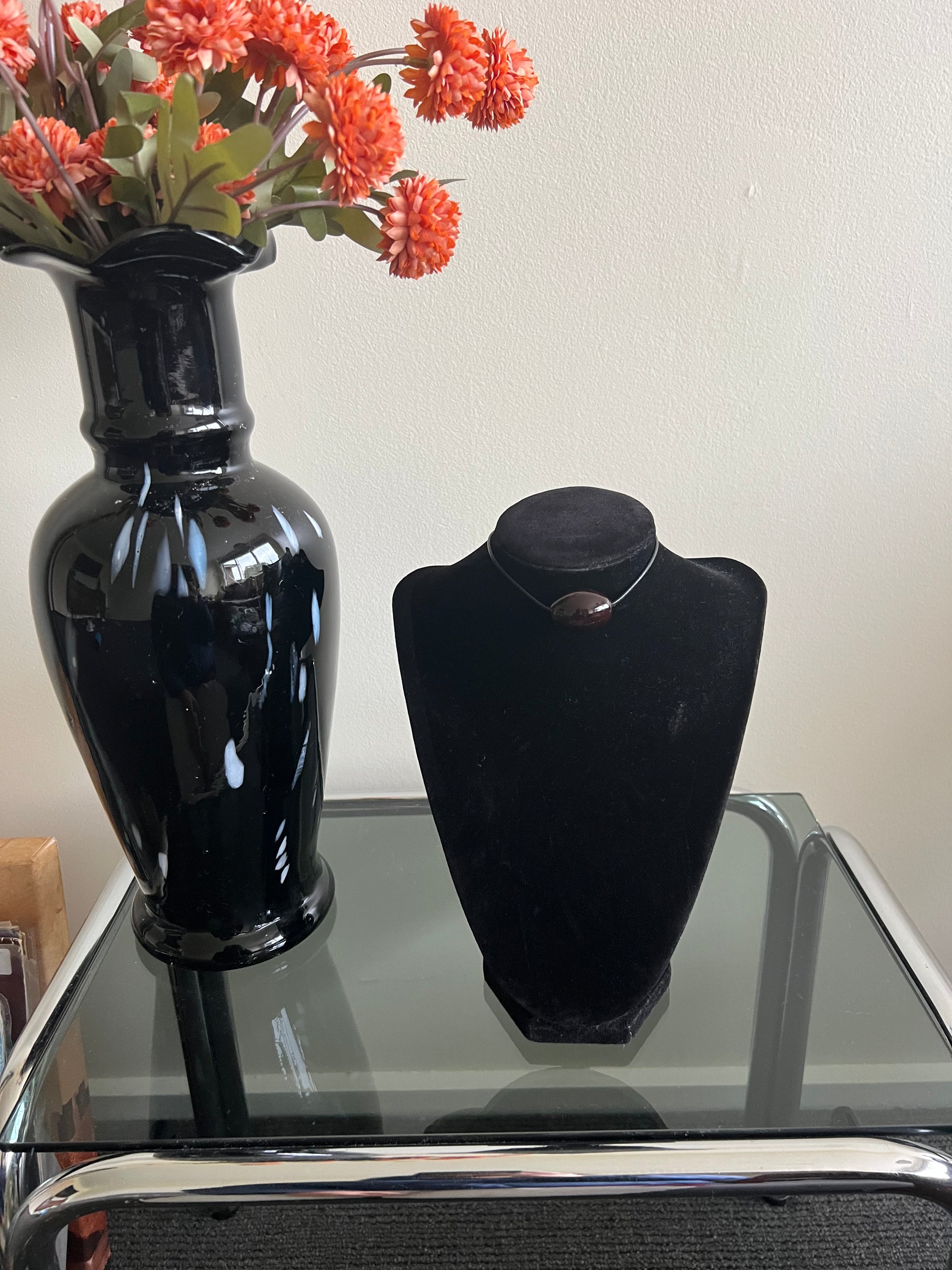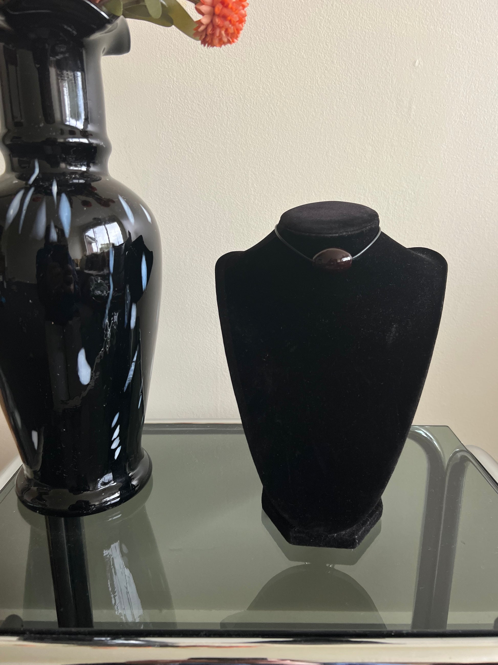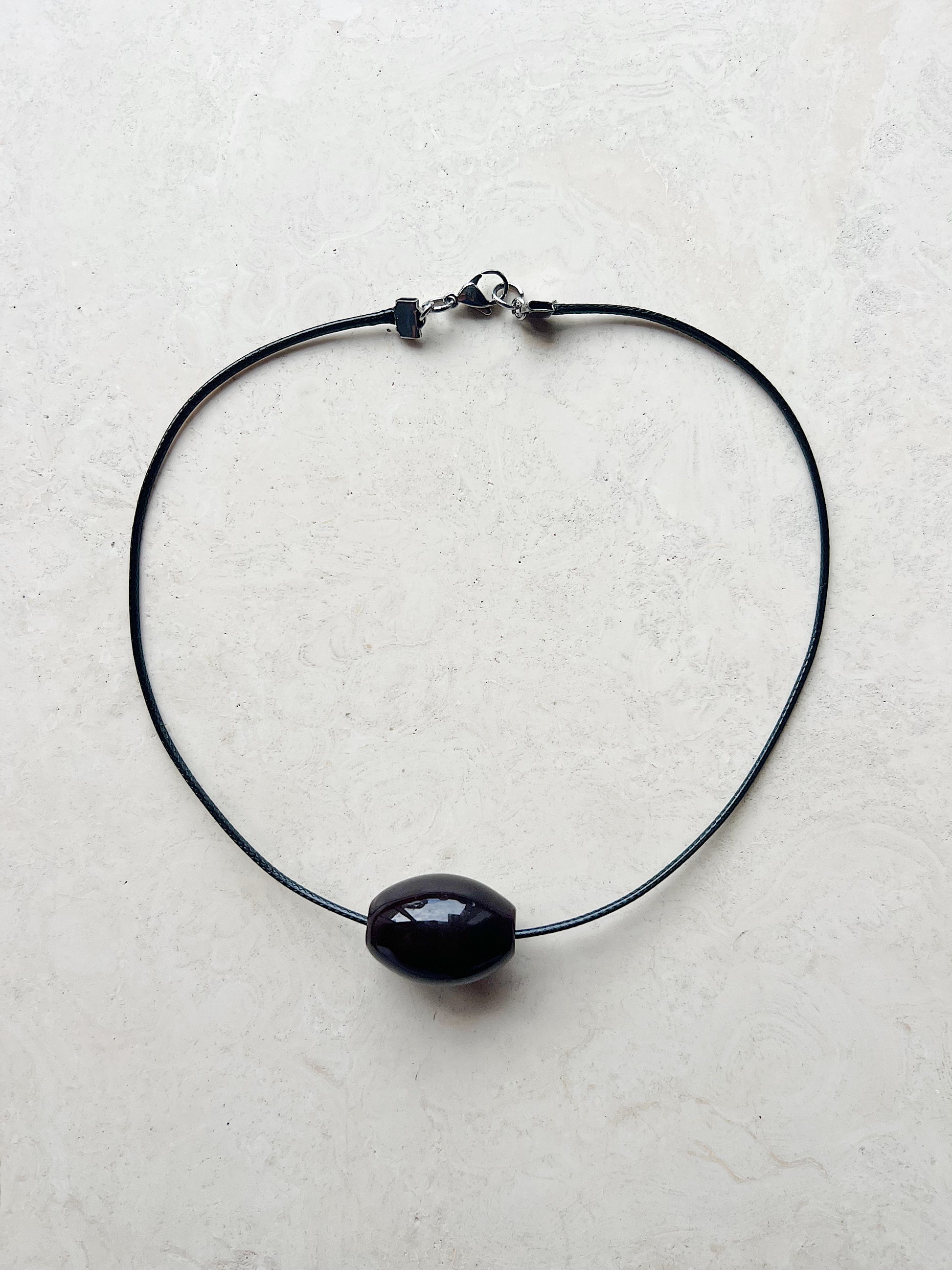 MATERIALS: black cord and a dark maroon resin bead with stainless steel findings