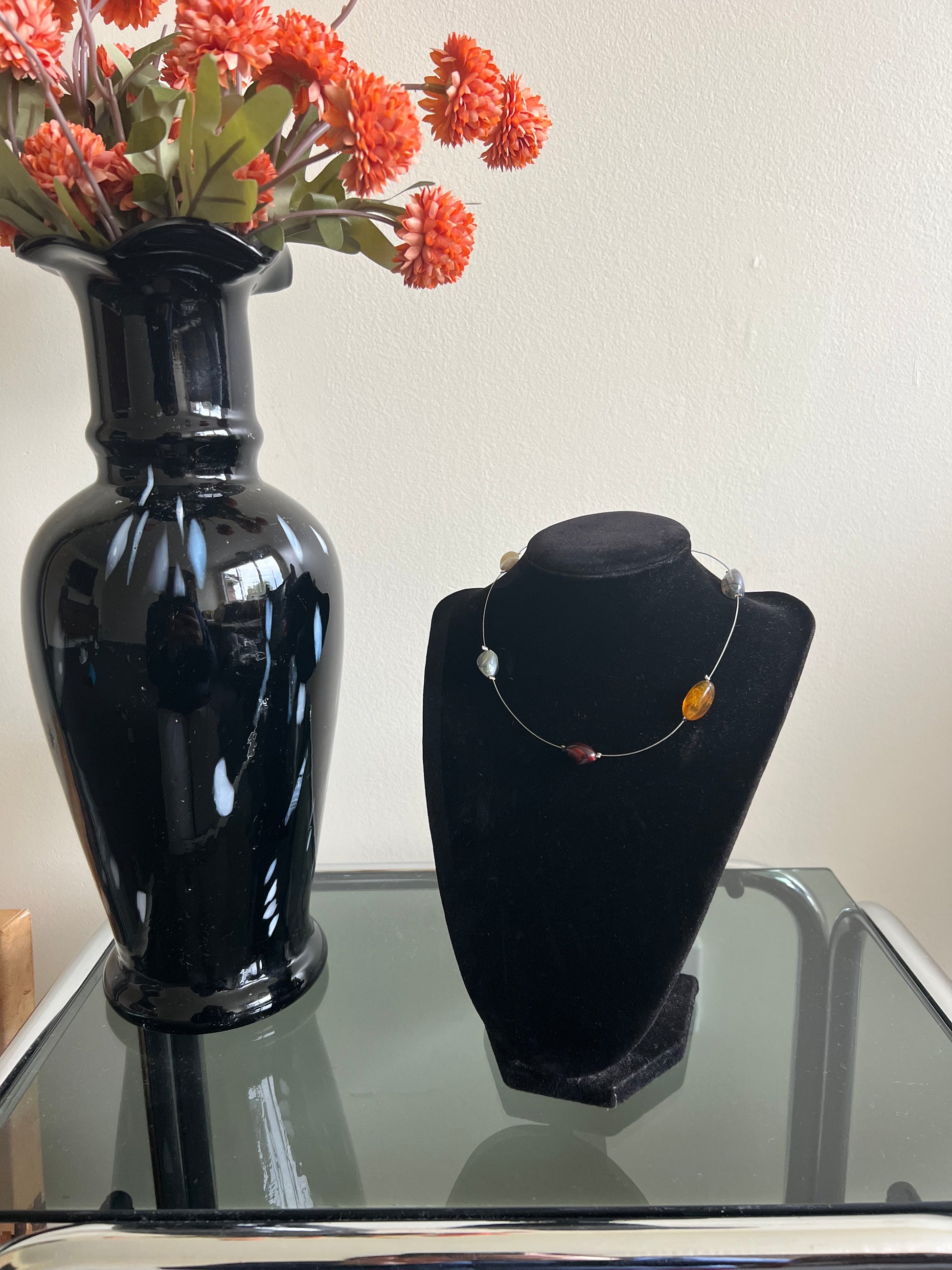 This reworked vintage piece is a wire necklace with an asymmetrical blend of earthy glass tones giving an effortless vibe.