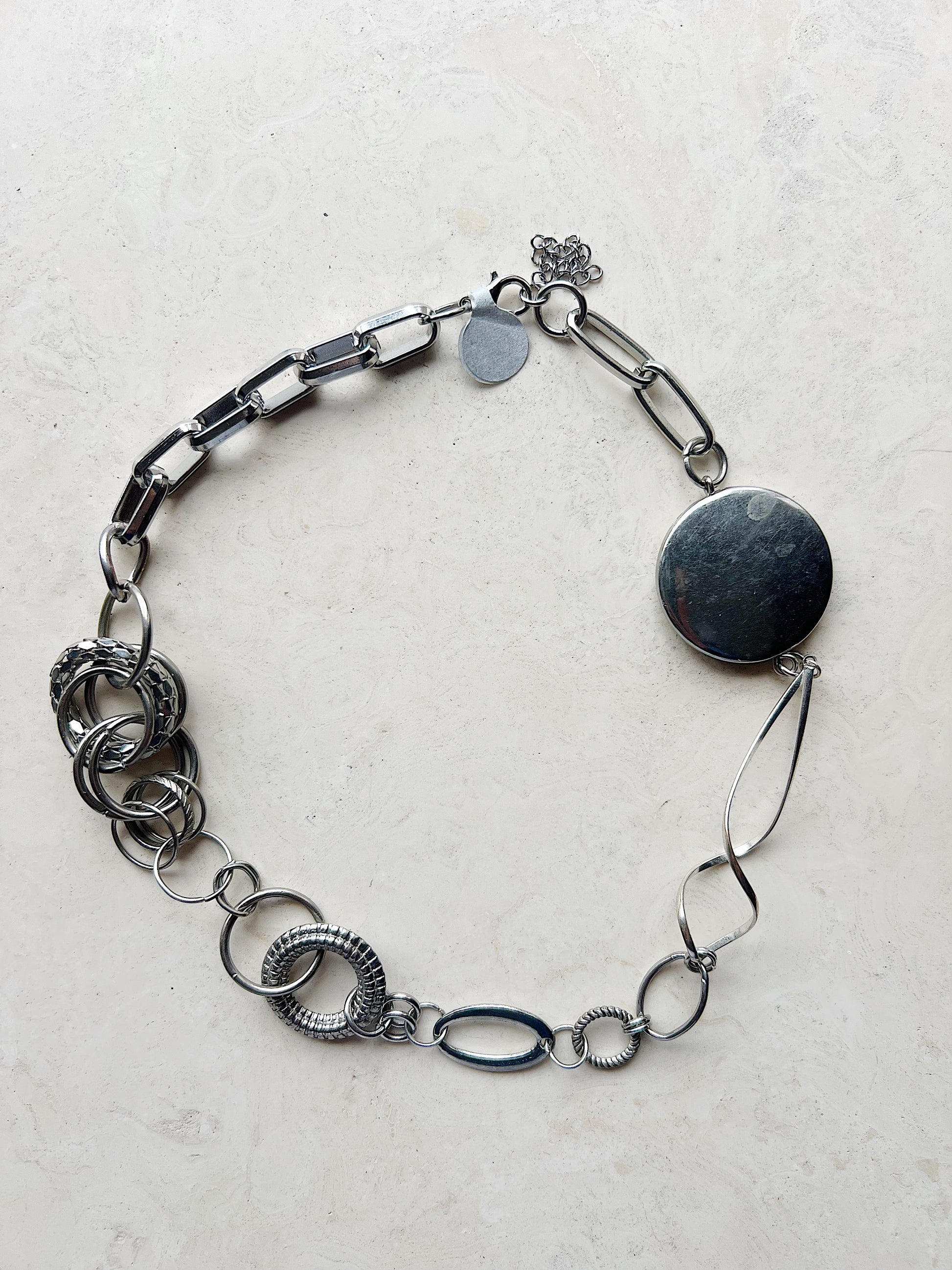 MATERIALS: silver toned mixed media metals used with chains and textured links, circular textured links, large and small oval connectors with stainless steel jump ring links.