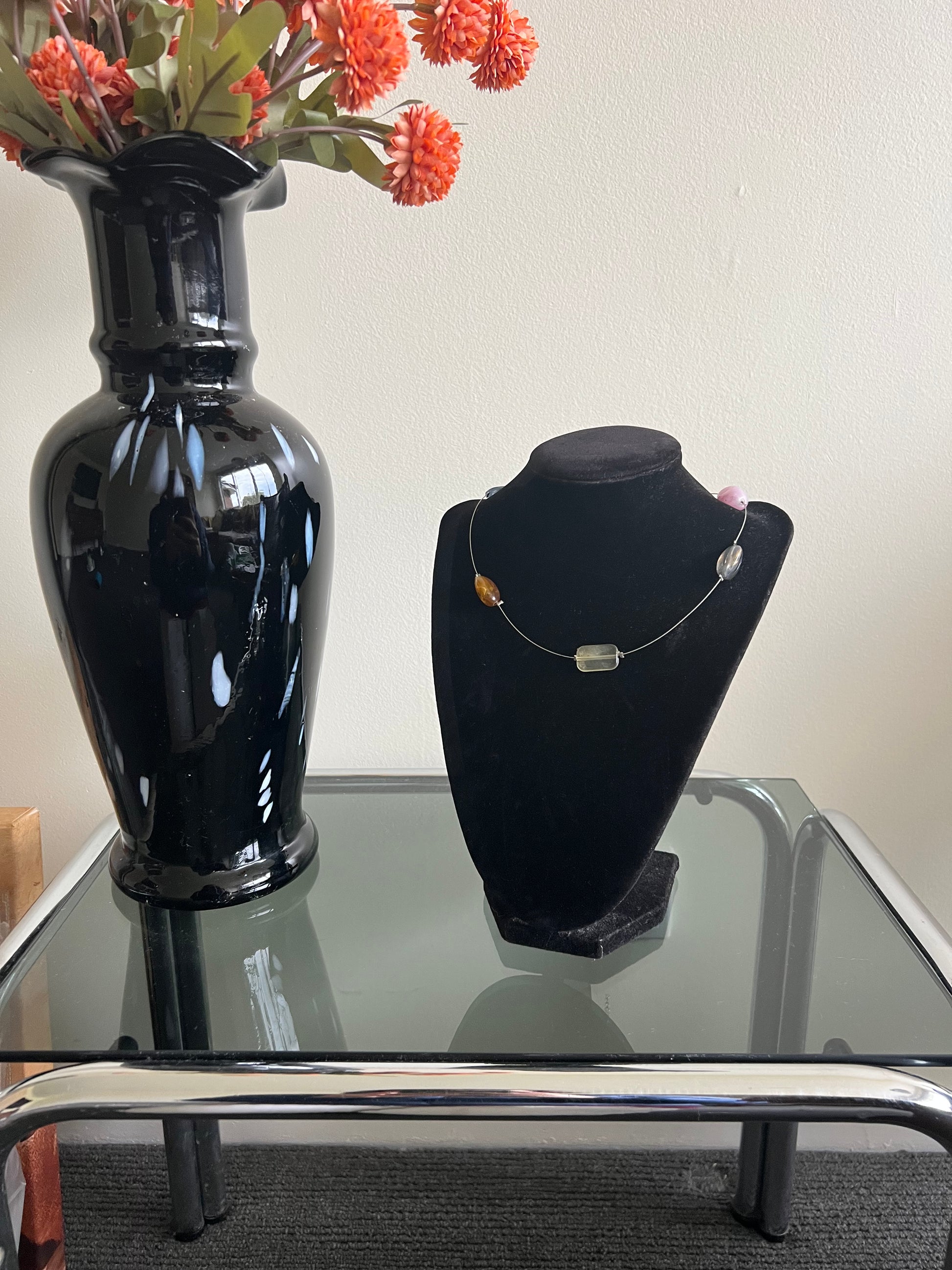 This reworked vintage piece is a wire necklace with an asymmetrical blend of baby pastel glass tones giving an effortless vibe.