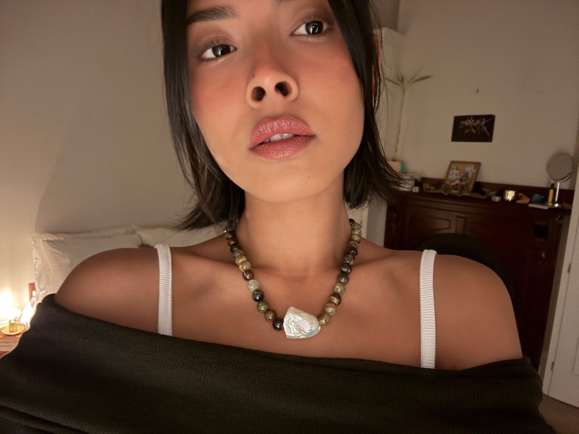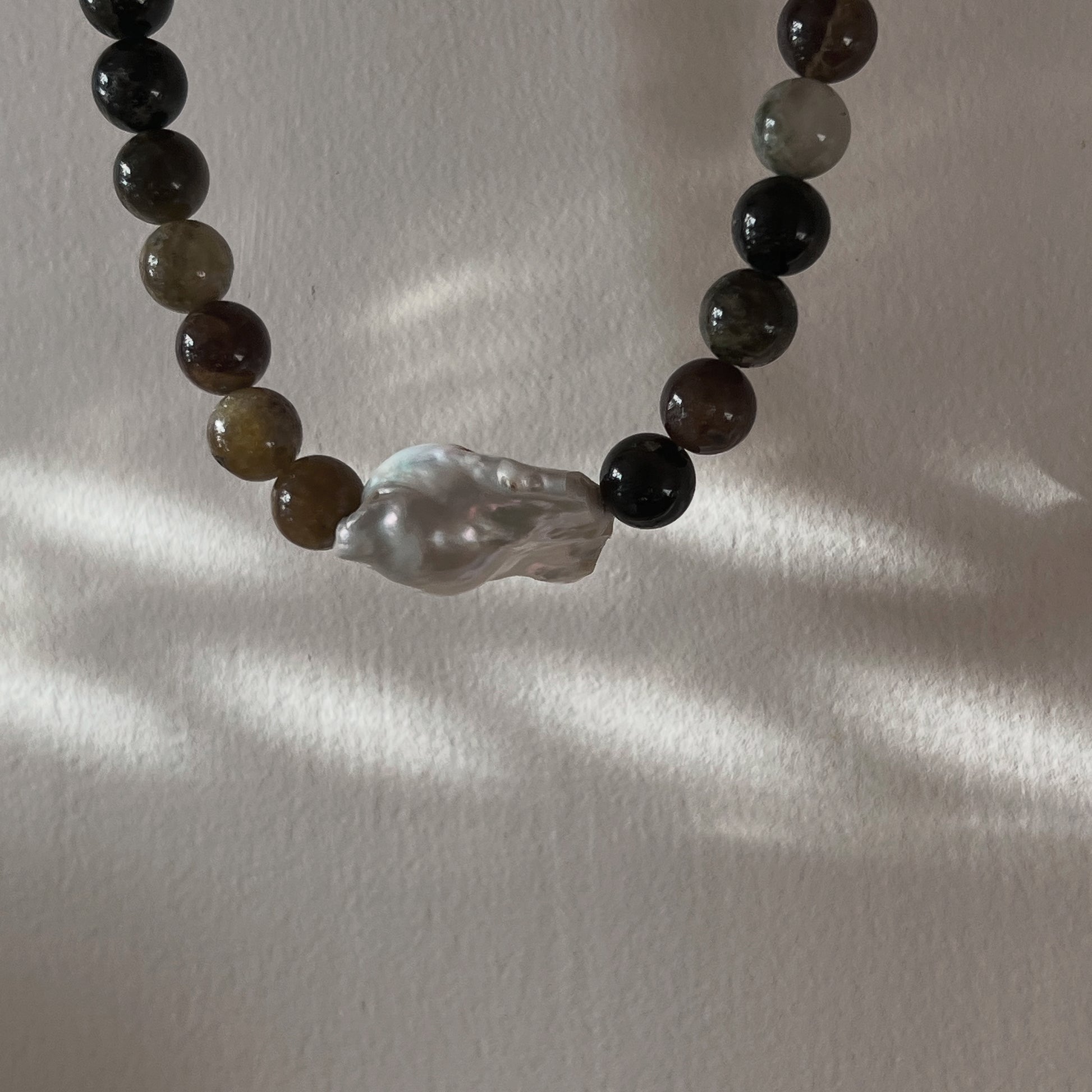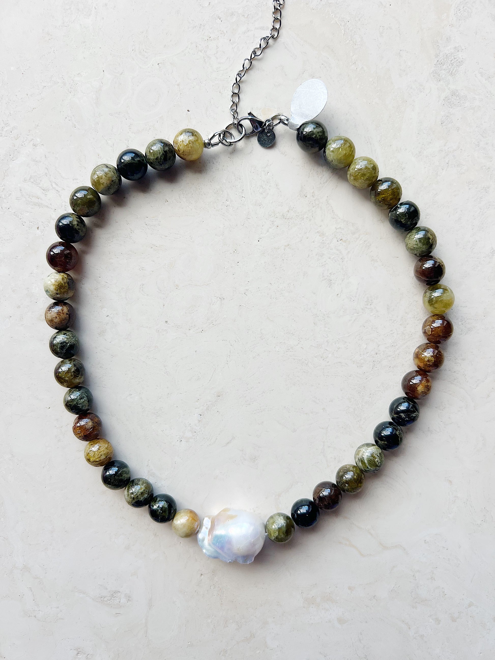 This piece is handmade with 8mm deep mossy green olive and earthy tones from the natural gemstone green tourmaline and a center piece baroque freshwater pearl known for its irregular shape and luminous glow. Stand out from the crowd with this piece.